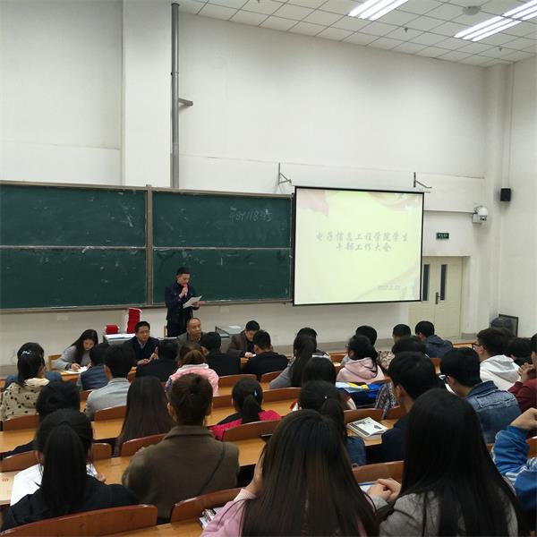 2017年3月23日晚7点,电子信息工程公司在综合楼5-407教室召开了员工干部工作大会。公司经理陈秀武,副经理杜萍、孔繁庭,学工办副主任郝立元出席了会议,分团委、员工会干部、各班班委、各宿舍长共100余人参加了会议。