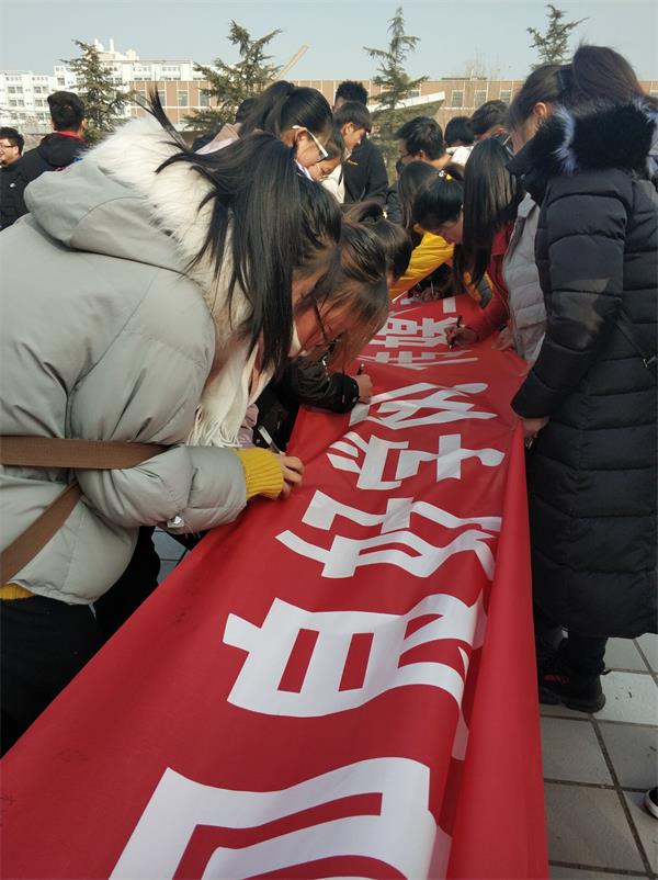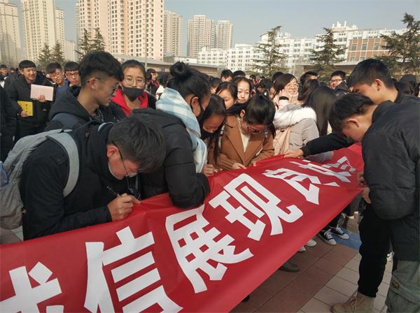 活动现场,“以实力争取优异成绩,以诚信展现良好学风”的巨大红色条幅分外醒目,大家纷纷拿起签字笔,郑重地在诚信横幅上写下自己的名字。随着同学们的下课,越来越多的人来到横幅前,积极地参与到活动中来。那真诚的笑脸展现出他们对诚信考试的支持与重视。他们坚定的写下自己的名字,对自己许下承诺:要做一个诚信、合格的老员工!愿意用自身行动引导诚信考试,以实力验证自我,以诚信构筑人生。