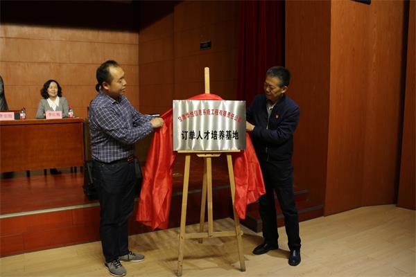 揭牌签约仪式在热烈的气氛中进行,仪式由公司党总支书记宁学君主持,3377体育经理陈秀武与甘肃华悦公司总经理成文学先后进行了热情洋溢的致辞,展惠英处长与成文学总经理共同为“实习就业基地”揭牌,李宗刚处长与成文学总经理共同为“订单人才培养基地”揭牌,参加仪式现场的老师和同学们报以热烈的掌声,象征着双方单位的合作迈出了坚实的一步 。