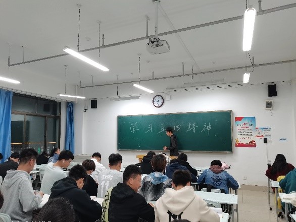 活动开始,由班长岳昊博对本次活动目的进行解说,紧接着由本班团支书何嘉悦对五四精神进行了介绍,并分享她对于五四精神的心得与体会。最后,同学们发表对五四精神的感悟。