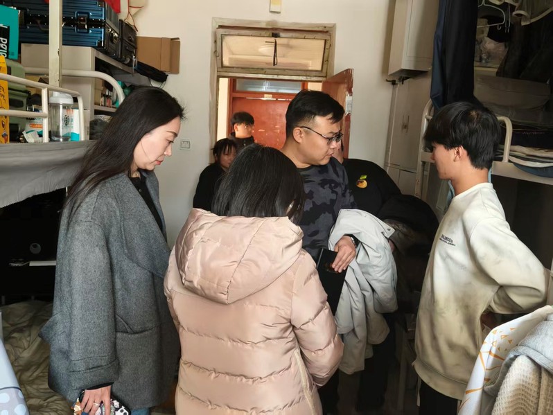 刘畅一行先后对11号女生宿舍楼、1号男生宿舍楼进行检查走访。走访过程中,刘畅与员工亲切交谈交流,详细询问同学们的生活需求,对宿舍内务卫生、人际关系、作息时间、用电安全等提出严格要求,对大多数宿舍整洁温馨的环境予以充分肯定,对个别宿舍存在的细节问题提出改进建议,勉励同学们持续弘扬互助友爱的宿舍文化,共同打造兼具舒适性与学习氛围浓厚的寝室空间。同时刘畅一行还全面排查了消防设施设备、疏散通道等方面的安全隐患,强化员工安全风险防范意识。